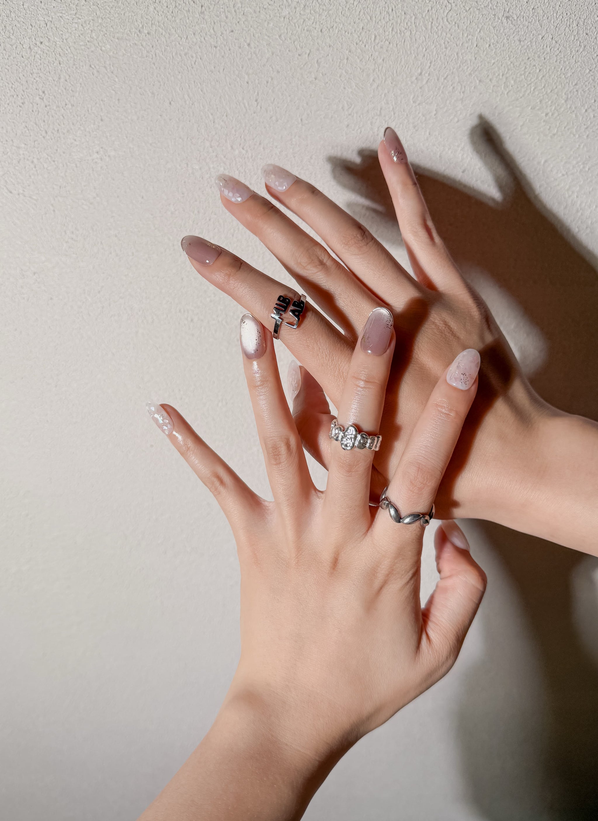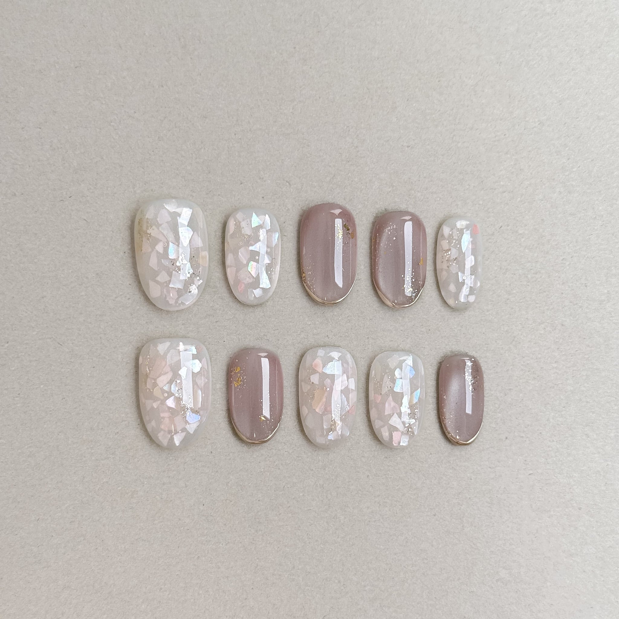 Merci : faux ongles réutilisables nude rosé et blanc nacré, détails lumineux, press on nails premium, finition brillante.