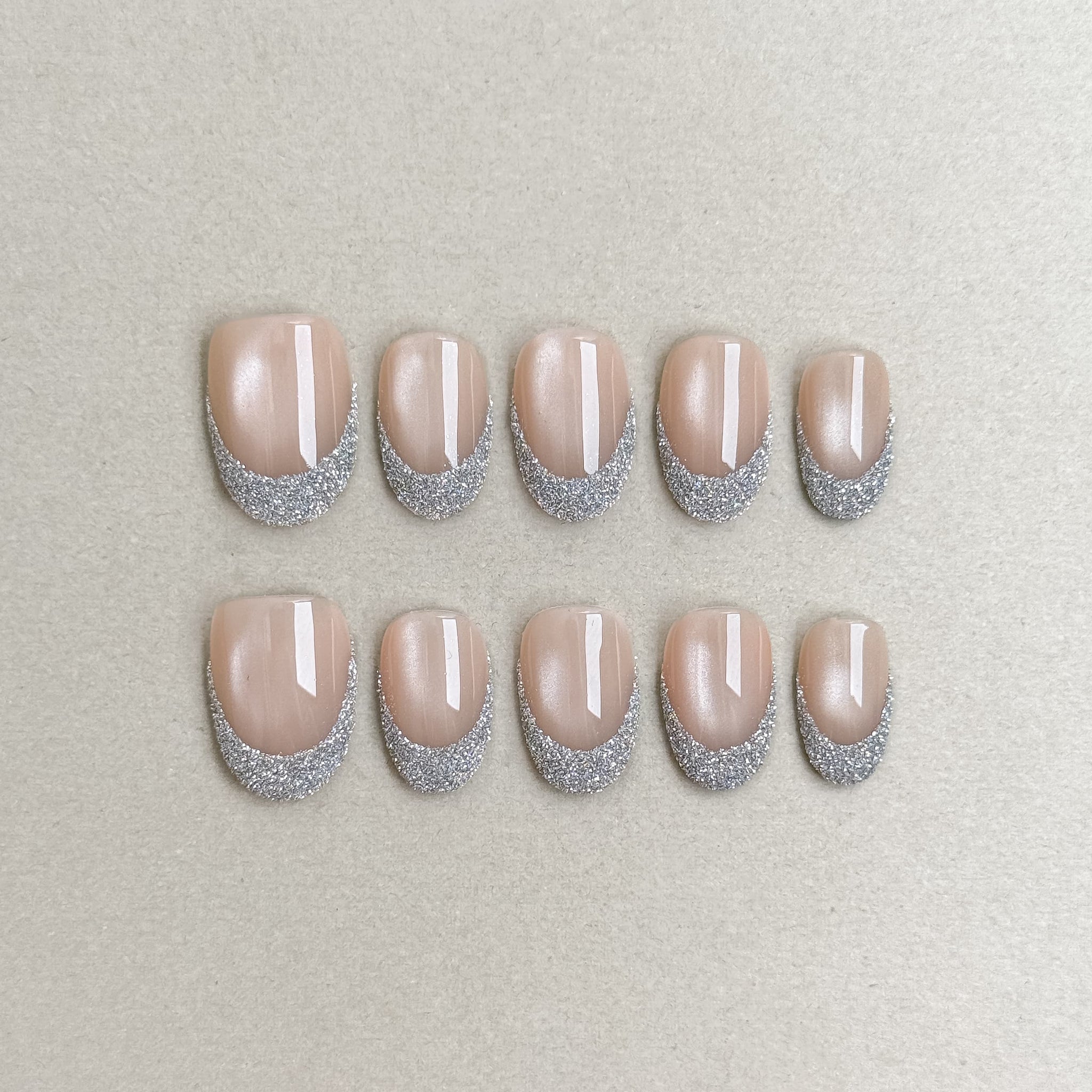 Éveil : faux ongles réutilisables nude rosé, reflets nacrés et bord argenté pailleté, press on nails premium, finition brillante.