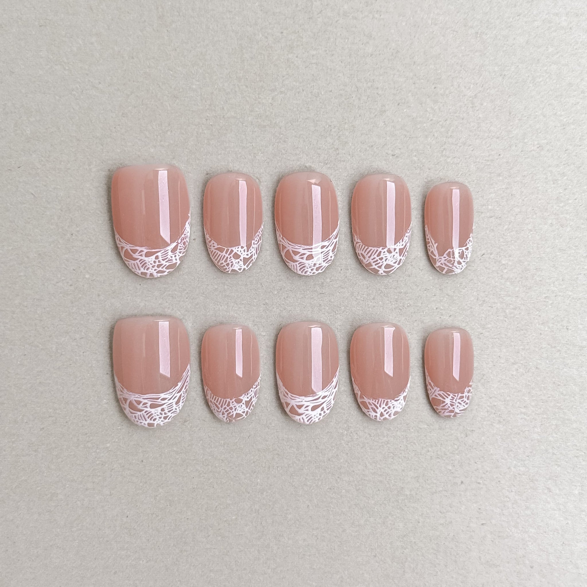 Honeylace : faux ongles réutilisables nude rosé avec contour dentelle blanche, press on nails premium, finition brillante.