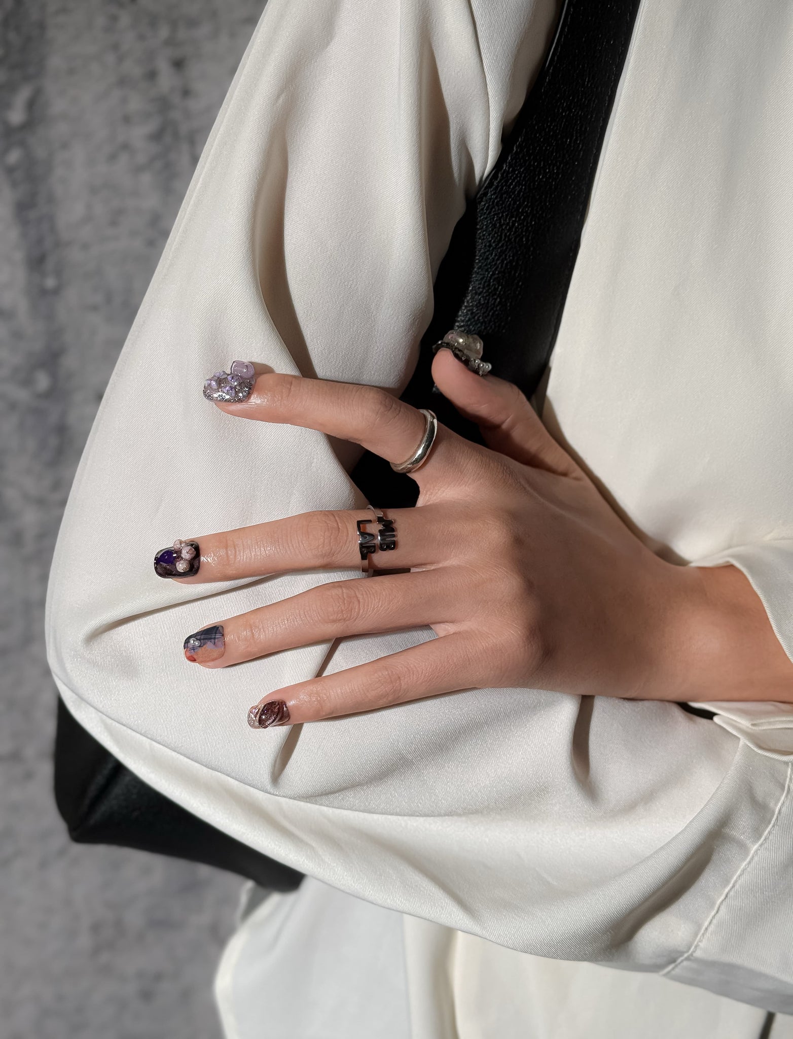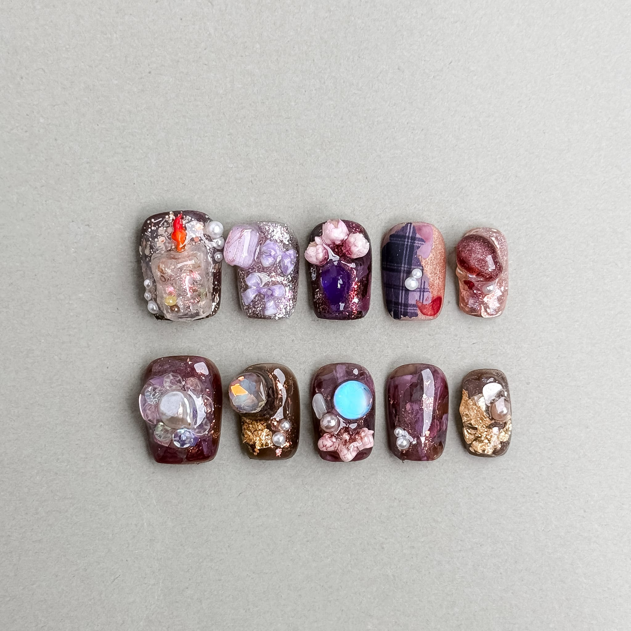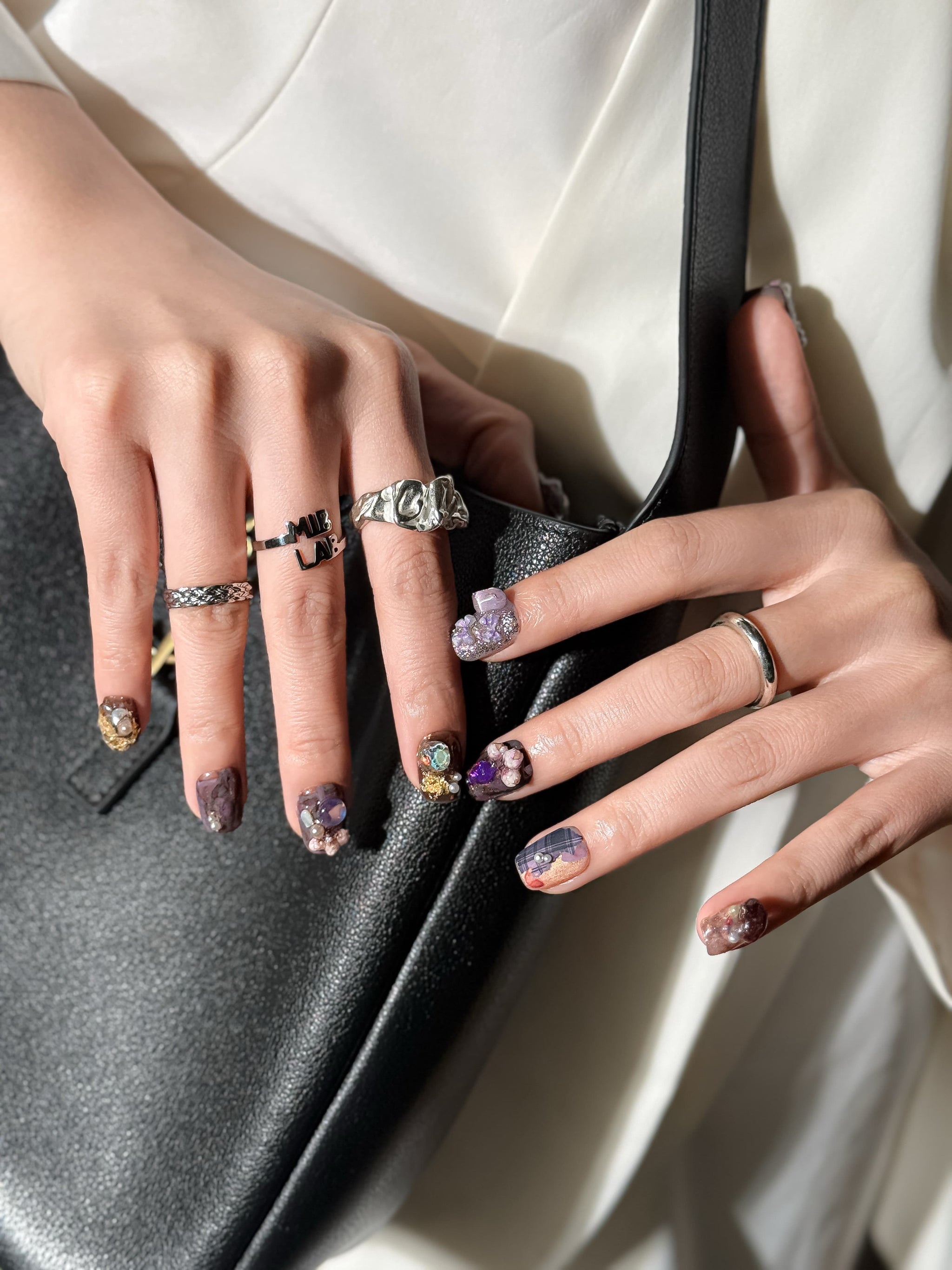 Palace of Wonders : faux ongles réutilisables multicolores, marbré violet-rose, paillettes et détails bijoux, press on nails premium.