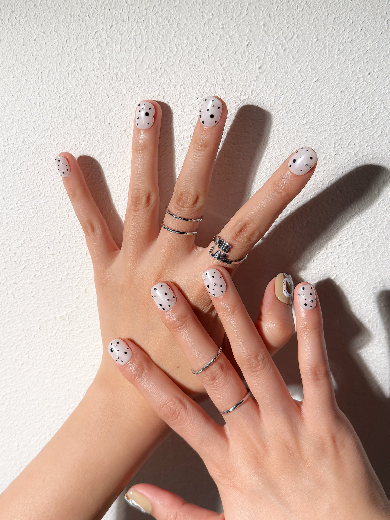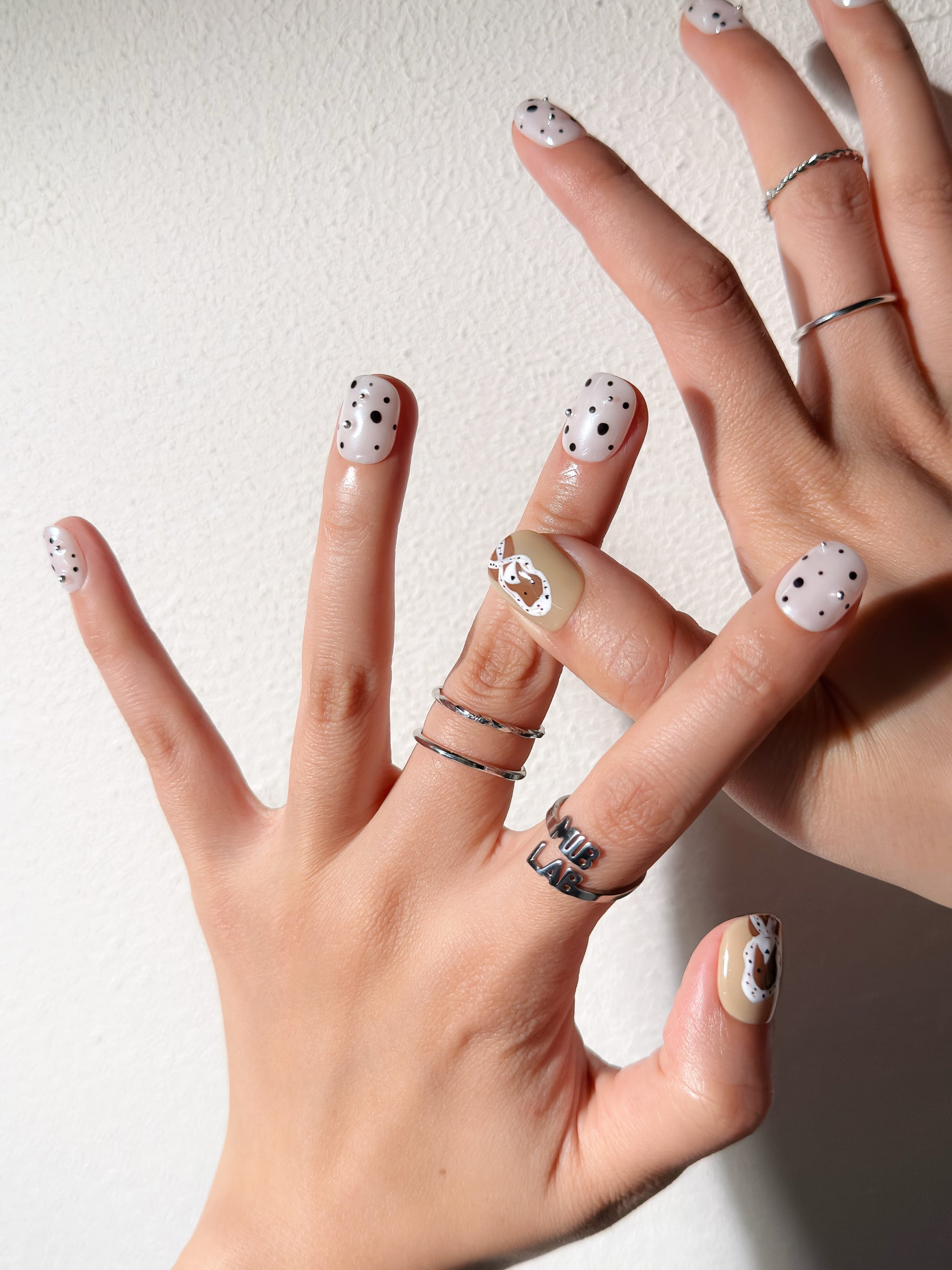 Manucure Poppy portée : press on nails blanc à pois, accent caramel avec fleur, look moderne, ongles sans gel, Genève.