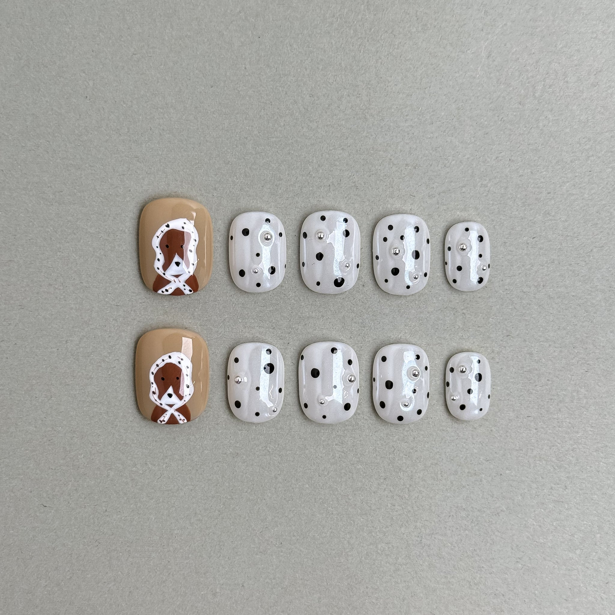 Poppy : faux ongles réutilisables blanc laiteux à pois noirs, accents brun caramel et fleur blanche, press on nails premium.