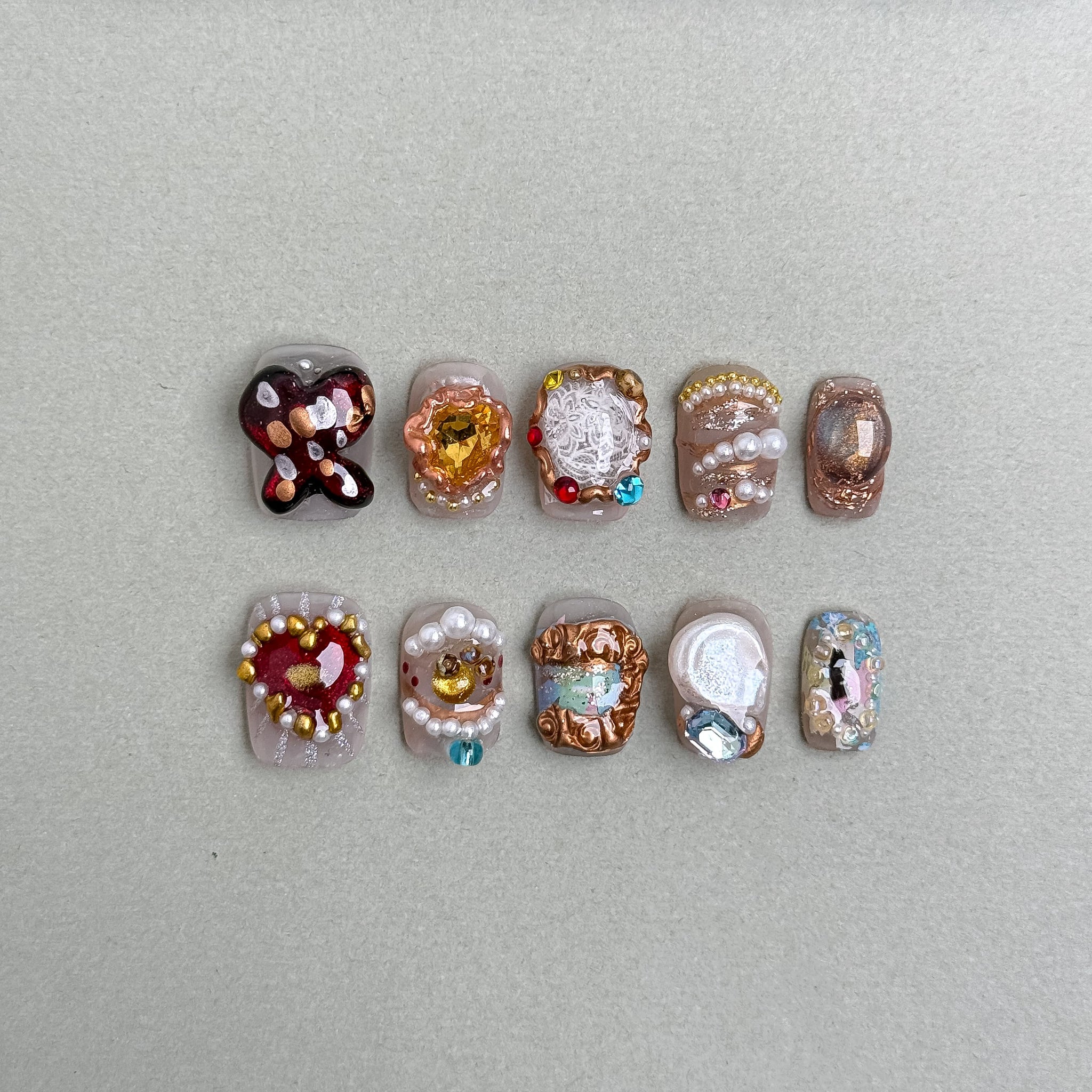 Heir : faux ongles réutilisables multicolores style bijou, motifs floraux et perles, accents dorés, press on nails premium.